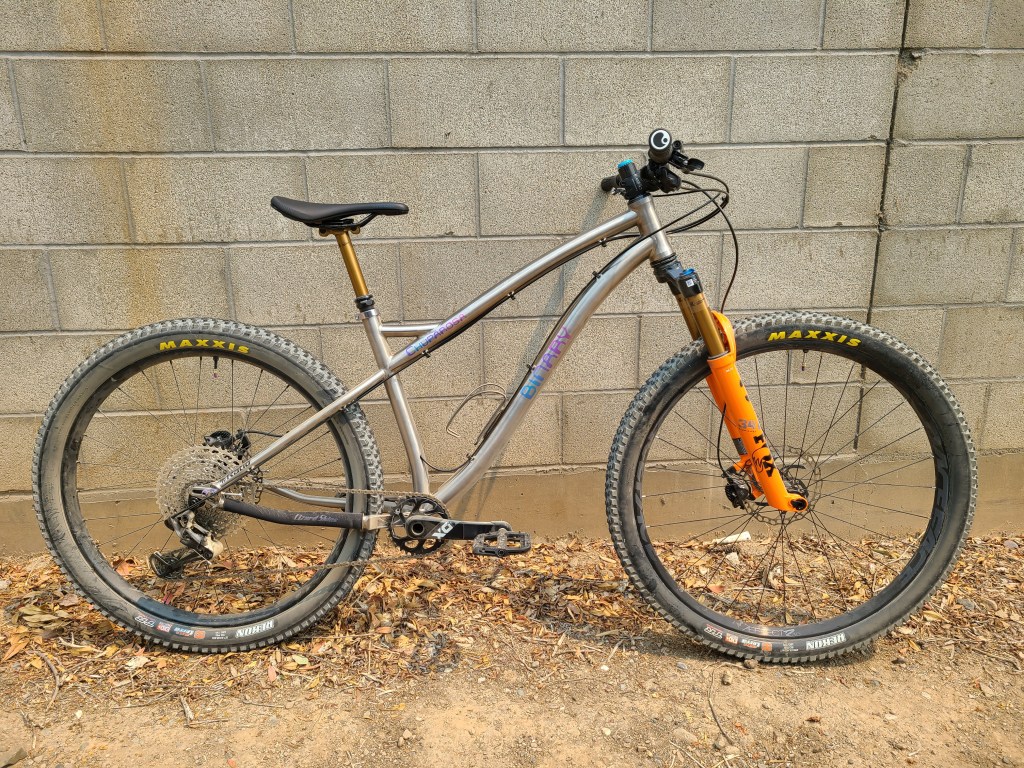 Binary Bikes Chuparosa. Titanium hardtail, 29″ front, 27.5″ rear wheel. Keeping it, I just can’t stop looking at it.