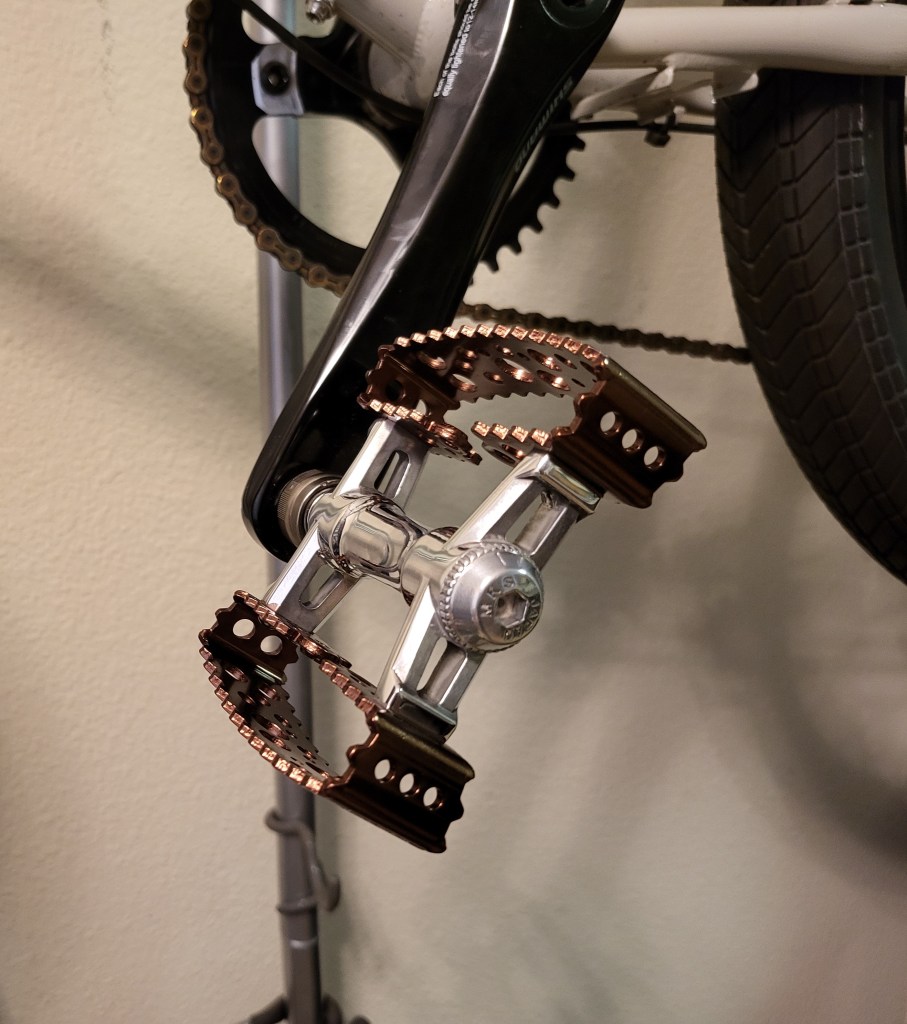 The next build is more just a slight modification to the Velo Orange Neutrino, swapped the Soma Clarence handlebars for the even more casually swept-back Soma Oxford. I just like being comfortable, these days. Then added some blingy pedals, the SimWorks Bubblys, which have a slick quick-detach system, keeping in line with the bike being small and meant for ease of transport.
