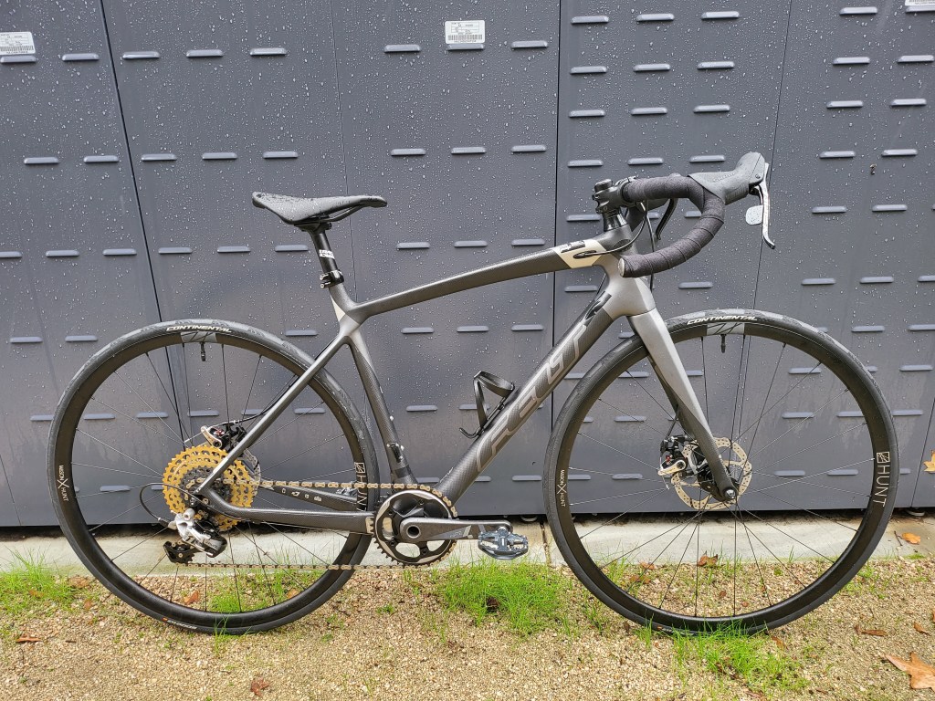 Used a bunch of leftover parts, combined with some select new ones. It’s got a Hunt gravel wheelset with Continental GP5000 700x25c tires set up tubeless, TRP Spyre Brakes, SRAM 1x Force/Rival/Apex drivetrain with a 9-42T Leonardi Racing cassette, and a mixed parts bin cockpit. The stem is super short, but this is mostly just me not liking the super long and laid out positioning on road bikes, I prefer to be a little more scrunched up with bent elbows to get low and aero.